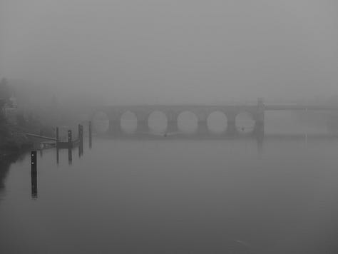 Distant objects fade into misty gray veils, while closer elements emerge like ghostly silhouettes.