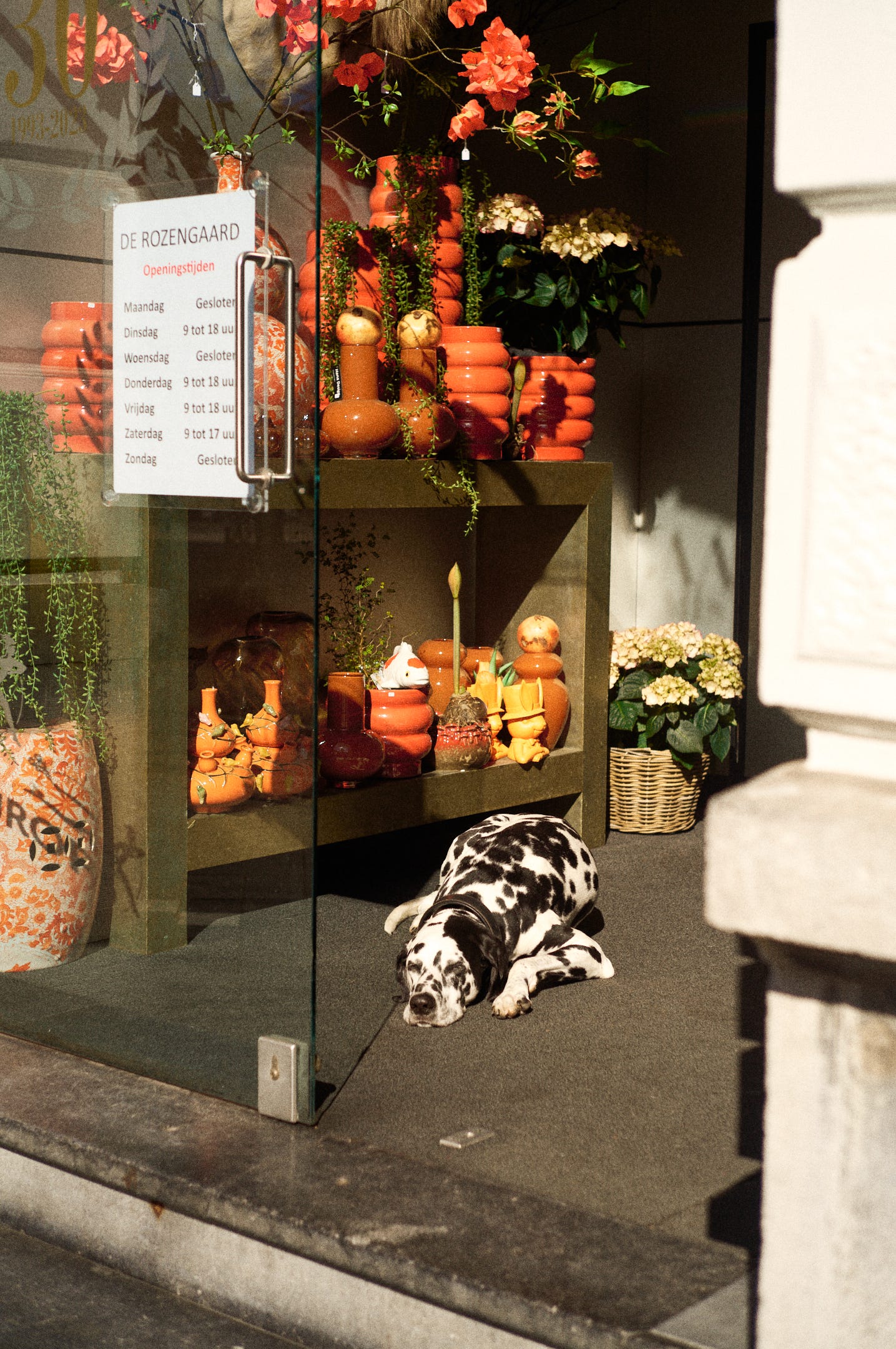 Or this colorful frame with this lovely Dalmatian dog enjoying a moment of pure calmness. I love exploring color theory all the time (and love seeing that people incorporate it into their window displays accordingly).